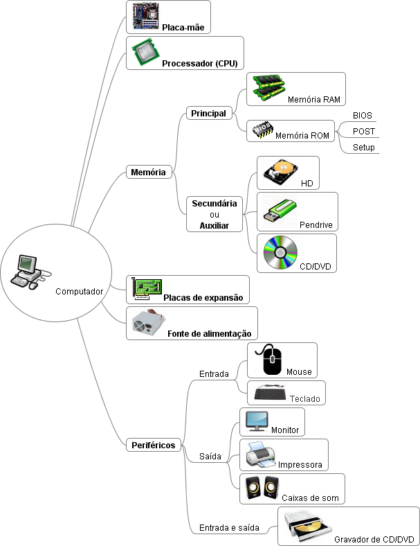 - Placa-mãe (mother board): principal placa do computador, onde tudo se liga.