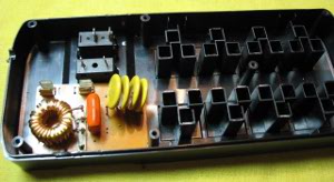 Filtro de linha (placa eletrônica) dentro de uma extensão de tomadas.