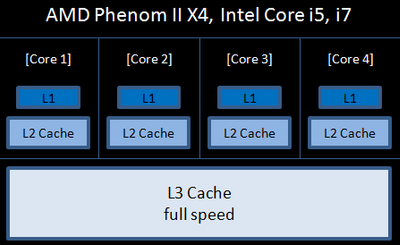 processadores modernos de mais de um núcleo (dual core ou quad core) a L3 voltou, sendo uma cache de tamanho maior para todos os núcleos, enquanto existe um conjunto L1 e L2 para cada núcleo (core).